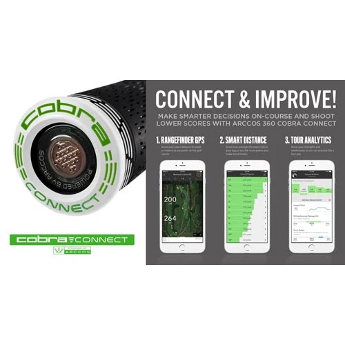 COBRA CONNECT, Powered by Arccos features electronically enabled grip that work in conjunction with the Arccos Caddle app. allowing users to track their stats and improve their game.