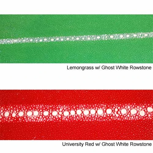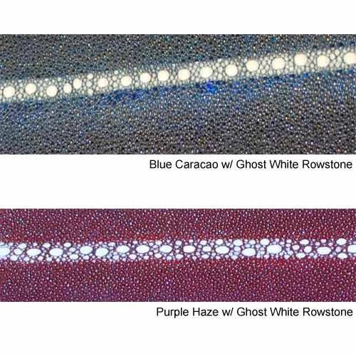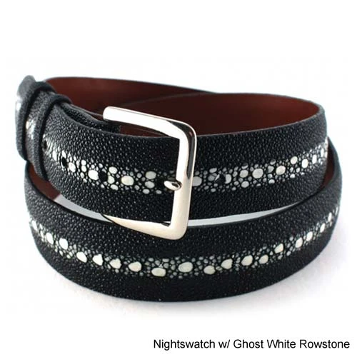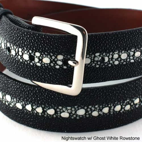 Jacob Hill Leather Rowstone Stingray 1 1/2 Leather BeltsOur 2013 Stingray belt in Nightswatch with Ghost White Rowstone. Great year round.All belts are custom order only. Our belts are not off the rack. They are custom made to your size and specifications. Please allow 2-3 weeks for your belt to be made and shipped to you. All belts come with a silver toned buckle. Please use the sizing guide below to assure correct sizing before placing your order.Belt Sizing Guide1. Using an old belt, put on the belt and use the hole in which it fits comfortably.2. Measure from the end of the belt to the hole use (as pictured below).3. This measurement (length) will be the middle hole (out of 5) of your new belt. This will be the size to use for length when placing your order