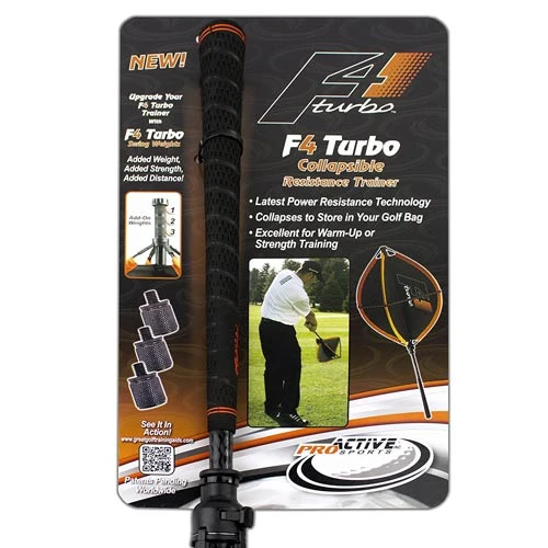 The F4 Turbo by ProActive Sports uses the proven technology of resistance training and has the unique advantage of collapsing for easy transportation. It functions like an umbrella, so it can easily be stored in your golf bag. Great for strengthening your swing for greater distance off the tee. Optional swing weights are available for purchase to the increase your strength and fine tune your F4 Turbo to match your swing.