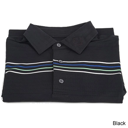 The Solid Texture polo from FootJoy is lightweight and moisture wicking and features SPF 30 protection for warmer days. The material is a light pique with engineered black tonal stripes. A color block mid chest and back includes white, royal blue and lime green stripes. Embroidery includes black tonal BV Wings on the right sleeve and FJ logo on the left collar with an additional white FJ logo on the back yoke. Sizing is typical full cut FootJoy.